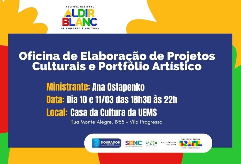 A Prefeitura de Dourados, por meio da Semc (Secretaria Municipal de Cultura), realiza a oficina “Mão na Massa”, que acontece hoje e amanhã, dias 10 e 11 de março, das 18h30 às 22 horas, na Casa da Cultura da UEMS (Universidade Estadual de Mato Grosso do Sul). A ação é voltada para agentes culturais e terá como foco orientar sobre todas as etapas que envolvem a elaboração e apresentação de projetos culturais.