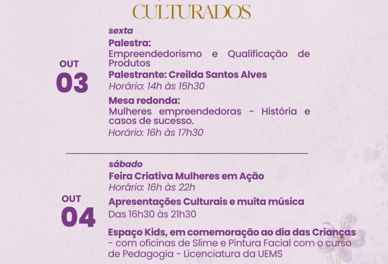 No sábado (4), das 16 às 22 horas, será realizada a Feira Criativa Mulheres em Ação, aberta ao público, com praça de alimentação, artesanato, moda, brechós e diversas atividades culturais. O evento contará ainda com apresentações artísticas, pipoca gratuita (das 17h às 21h), Espaço Kids em comemoração ao Dia das Crianças (com oficinas de slime e pintura facial promovidas pelo curso de Pedagogia da UEMS), além de Feira do Livro, ações sociais e exposição de artesanato indígena.