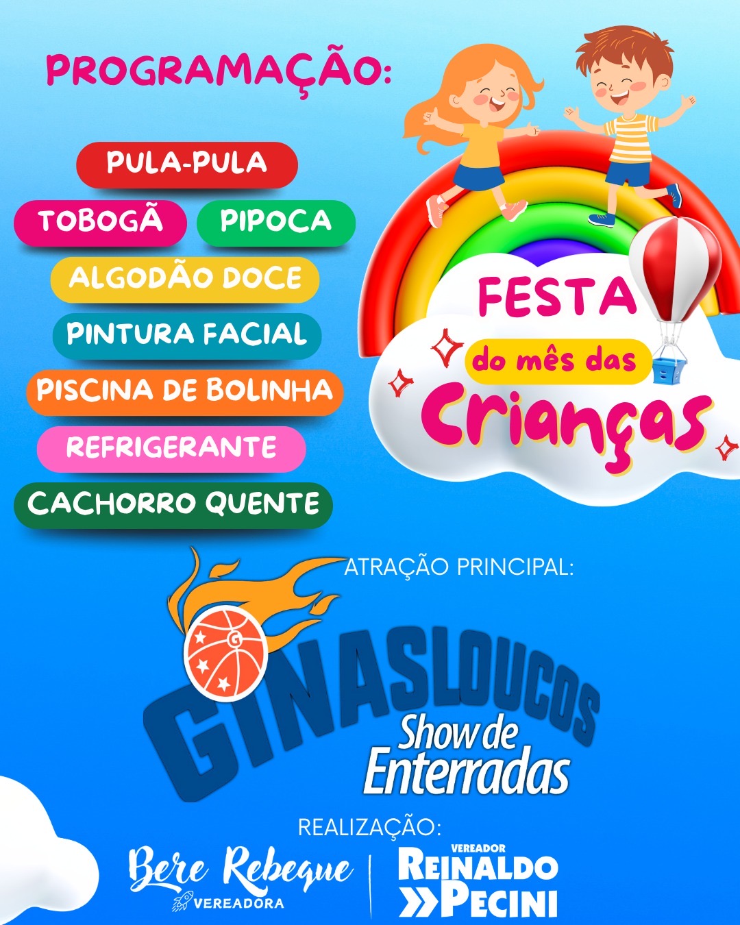 A programação contará com pula-pula, tobogã, piscina de bolinhas, pintura facial, algodão doce, pipoca, refrigerante e cachorro-quente, tudo gratuito durante o evento. Além das brincadeiras e guloseimas, a grande atração da tarde será o grupo GINASLOUCOS, da cidade de Dourados, que promete encantar o público com o famoso 'Show de Enterradas', misturando acrobacias, música e muita animação.