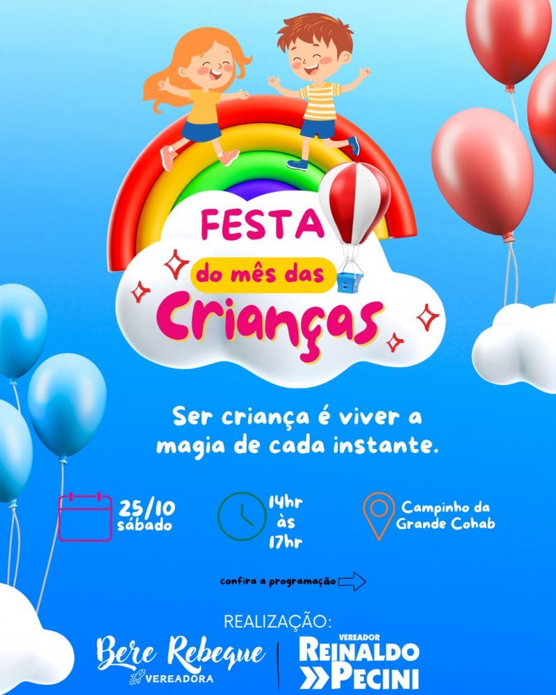 A comunidade de Itaporã terá um sábado especial dedicado à alegria da criançada. No próximo sábado, 25 de outubro, acontece a Festa do Mês das Crianças, no campinho da Grande Cohab, das 14h às 17h, com uma ampla programação gratuita voltada ao público infantil.